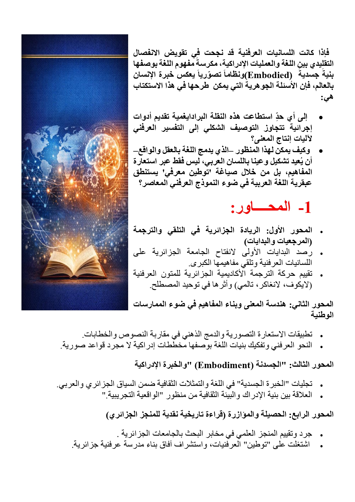 يفتح هذا المشروع البحثي آفاقاً للنقاش حول عدة محاور جوهرية: 1️⃣ الريادة الجزائرية في التلقي والترجمة: المرجعيات والبدايات وتقييم الحركة الأكاديمية. 2️⃣ هندسة المعنى وبناء المفاهيم: تطبيقات الاستعارة التصورية والنحو العرفني. 3️⃣ “الجسدنة” (Embodiment) والخبرة الإدراكية: تجليات الخبرة الجسدية في السياق الثقافي والعربي. 4️⃣ الحصيلة والمؤازرة: قراءة تاريخية نقدية للمنجز الجزائري في مخابر البحث.