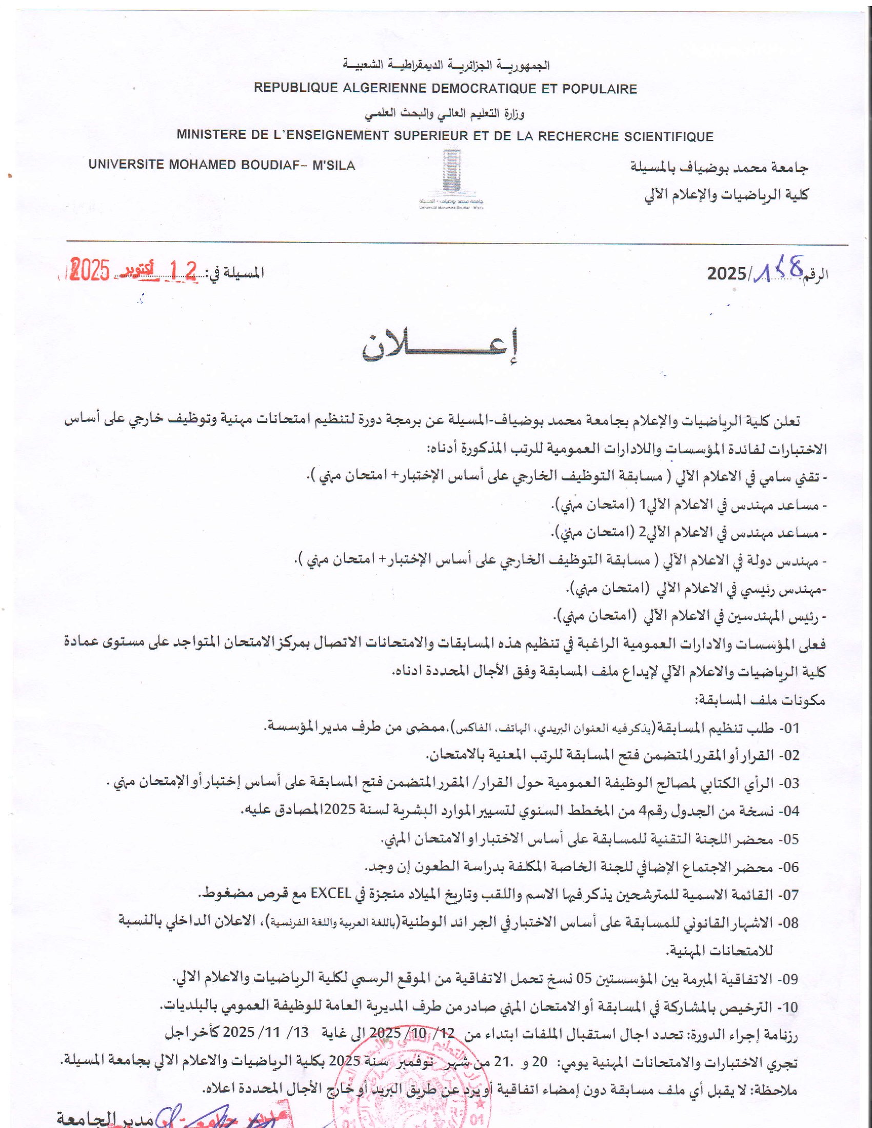 تعلن كلية الرياضيات والاعلام الالي بجامعة محمد بوضياف بالمسيلة عن تنظيم امتحانات مهنية، وتوظيف خارجي على أساس الاختبارات لفائدة المؤسسات والإدارات العمومية للرتب المذكورة في المنشور المرفق