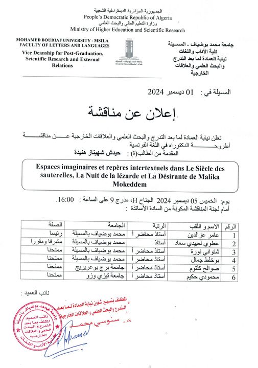 إعلان عن مناقشة أطروحة الدكتوراه في اللغة الفرنسية الطالبة حيدش شهيناز هنيدة يوم 05 ديسمبر 2024