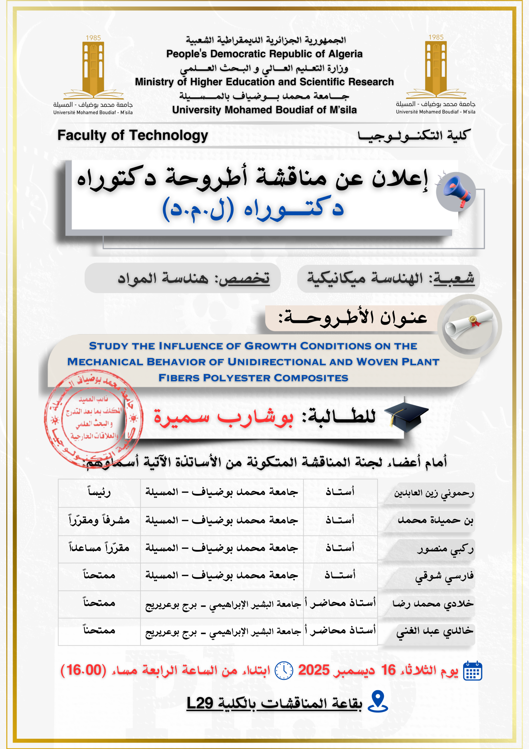 تعلن كلية التكنولوجيا بجامعة محمد بوضياف بالمسيلة عن مناقشة أطروحة الدكتوراه الطور الثالث للطالب :