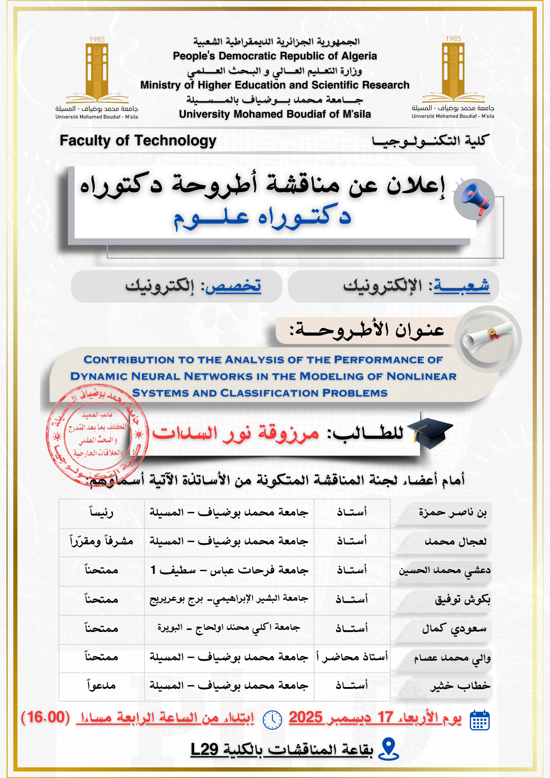 تعلن كلية التكنولوجيا بجامعة محمد بوضياف بالمسيلة عن مناقشة أطروحة الدكتوراه العلوم  للطالب :