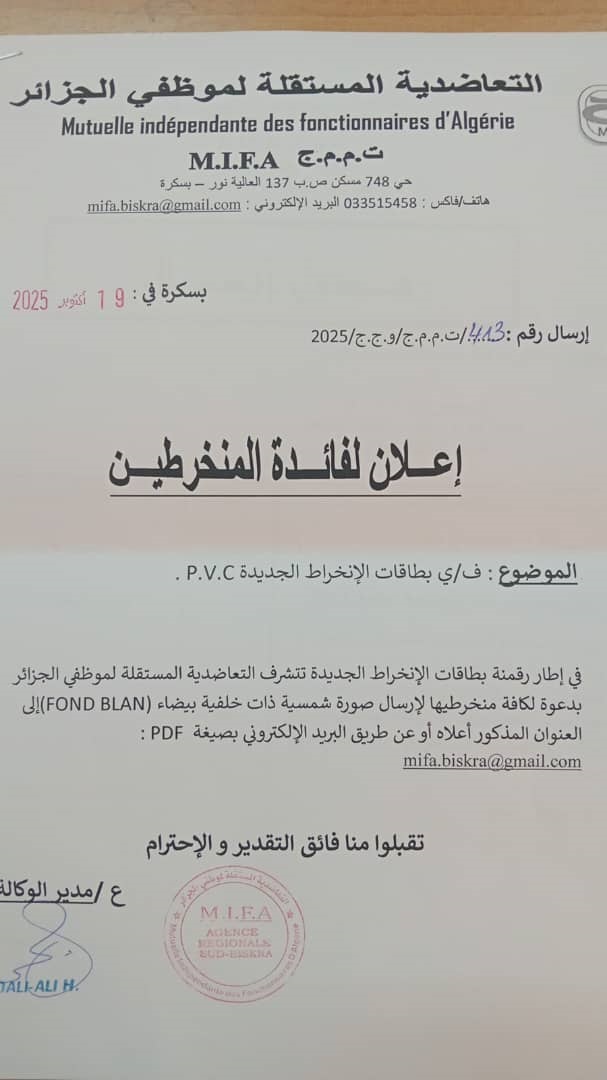 نعلم جميع المنخرطين بالتعاضدية المستقلة لموظفي الجزائر أنه سوف تجدد بطاقات الانخراط بطراكثر تفاصيل يقة رقمية حديثة …..