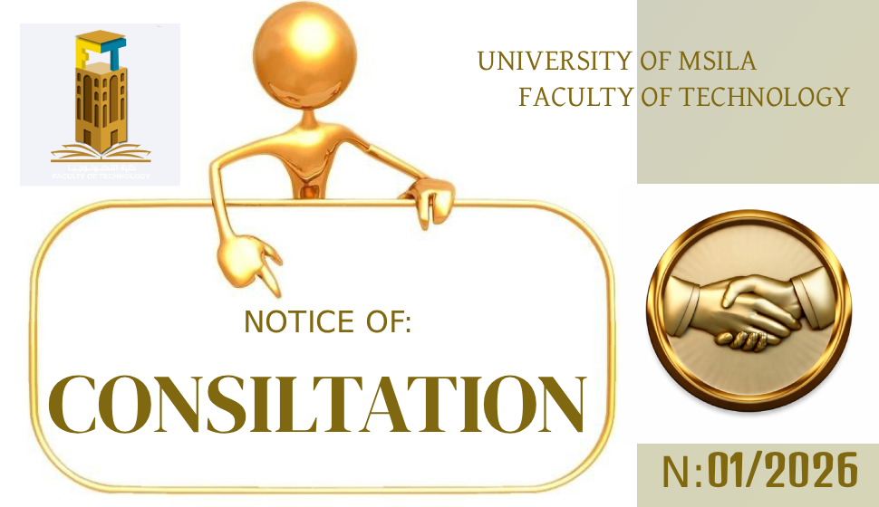 تعلن كلية التكنولوجيا بجامعة محمد بوضياف المسيلة عن إطلاق الاستشارات التالية للسنة المالية2026: