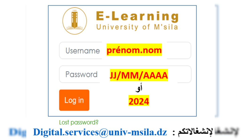 ليكن في علم أساتذة و طلبة جامعة محمد بوضياف بالمسيلة، ان الدخول للفضاء الرقمي للطالب DWS ومنصة موودل Moodle كما هو موضح في الصور أدناه. على أن يقوم الأستاذ بتعيين كلمة مرور جديدة وحفظها.