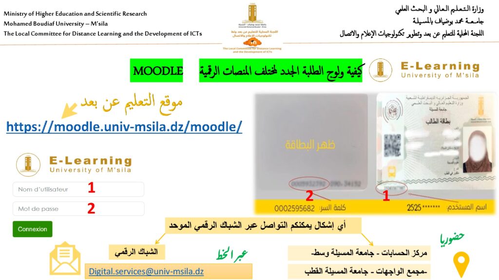 عند مواجهة أي إشكال تقني أو استفسار، يُرجى التواصل مع الشباك الرقمي عبر البريد الإلكتروني Digital.services@univ-msila.dz
