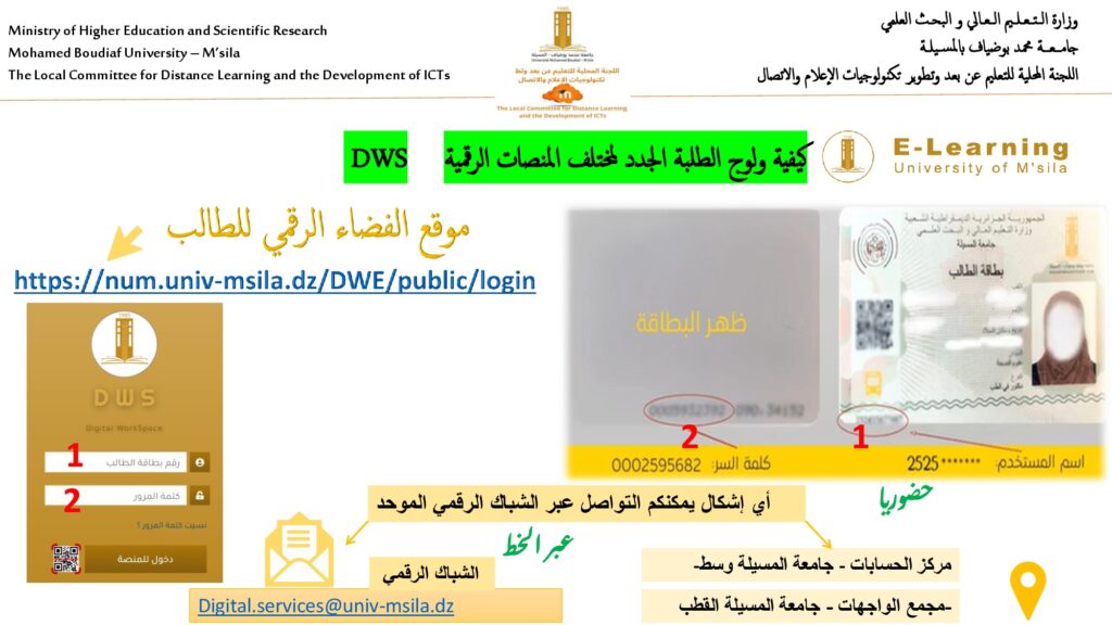 - الفضاء الرقمي للطالب (DWS): https://num.univ-msila.dz/DWE/public/login