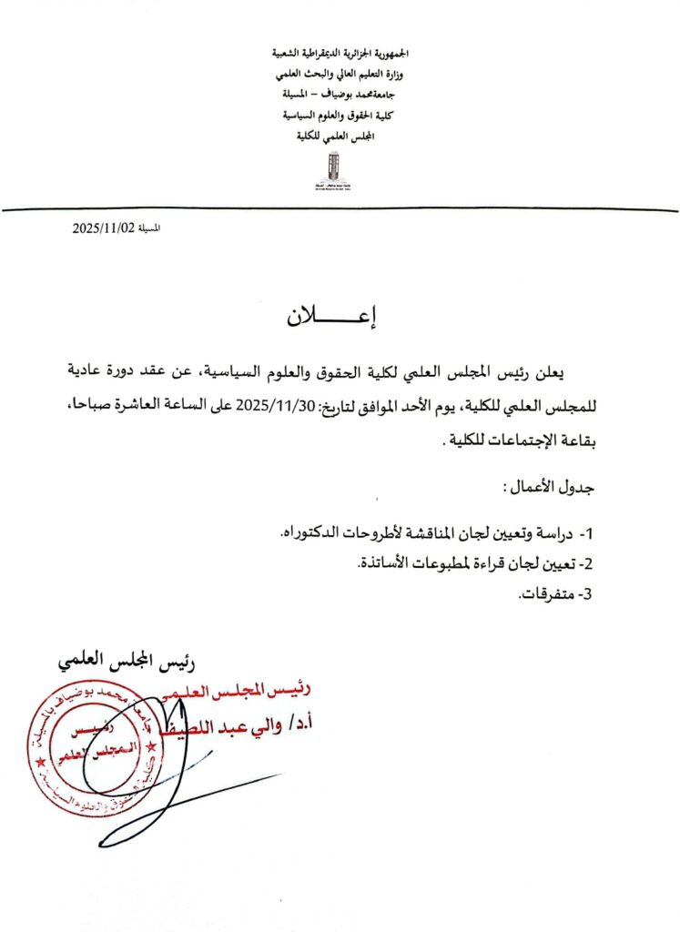 تعلن كلية الحقوق والعلوم السياسية بجامعة محمد بوضياف بالمسيلة عن عقد دورة عادية للمجلس العلمي للكلية وذلك يوم الأربعاء 2025/11/30 على الساعة العاشرة صباحا، بقاعة الإجتماعات للكلية.