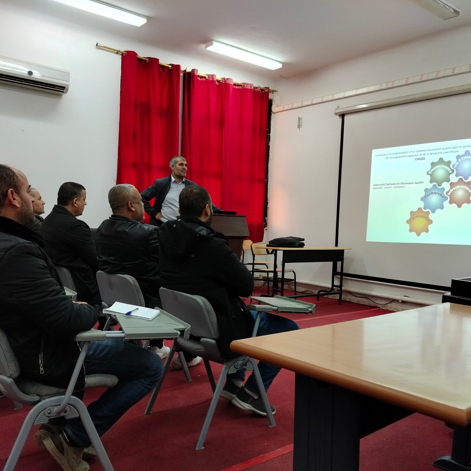 أُطر هذا اللقاء من طرف مسؤول خلية ضمان الجودة بجامعة المسيلة د. حسين ڨانة، وعضو خلية ضمان الجودة ومسؤول مكتب الربط بين الجامعة والمؤسسات د. أحمد الجربي، بحضور السيد عميد كلية العلوم أ.د. رابح بونار، وتحت إشراف رئيس خلية ضمان الجودة أ. د. نجيب بعجي، وبمشاركة أعضاء خلية ضمان الجودة على مستوى الكلية.