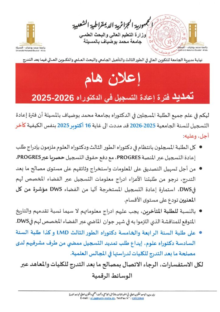 تعلن مديرية جامعة محمد بوضياف بالمسيلة للتكوين العالي في الطور الثالث و التأهيل الجامعي و البحث العلمي و التكوين العالي فيما بعد التدرج، عن تمديد فترة إعادة التسجيل في طور الدكتوراه 2025-2026 إلى غاية 16 أكتوبر 2025 كآخر أجل، كما هو موضح أدناه.