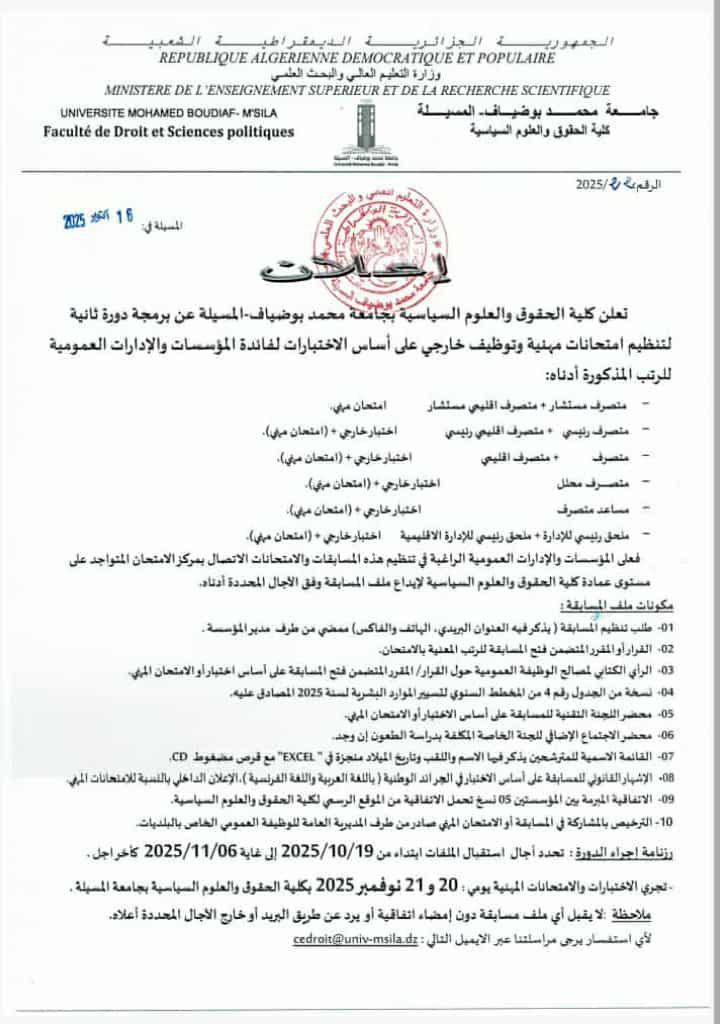تعلن كلية الحقوق والعلوم السياسية – جامعة محمد بوضياف المسيلة عن فتح دورة لتنظيم امتحانات مهنية وتوظيف خارجي لفائدة المؤسسات والادارات العمومية للإلتحاق برتب محددة.