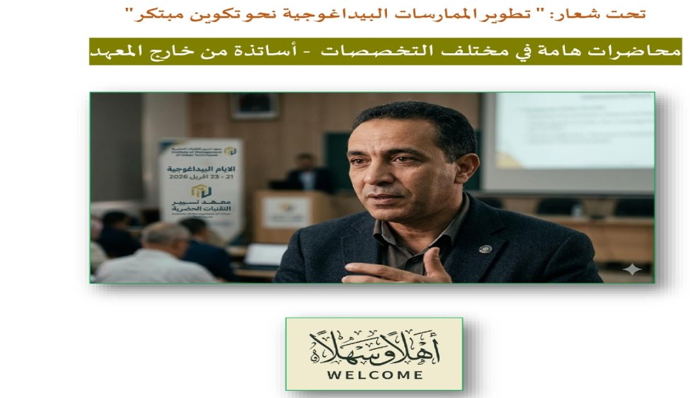 تحت شعار: ” تطوير الممارسات البيداغوجية نحو تكوين مبتكر” ينظم معهد تسيير التقنيات الحضريةمحاضرات هامة في مختلف-التخصصات و هذا بحضور اساتذة من خارج المعهد يومي :23/22 افريل 2026