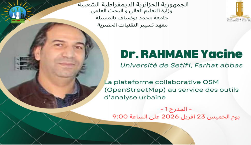 في إطار الأيام البيداغوجية التي ينظمها معهد تسيير التقنيات الحضرية بجامعة محمد بوضياف بالمسيلة من 21 إلى 23 أفريل 2026 سوف يتم القاء محاضرة من طرف الدكتور دحمان ياسين تحت عنوان : La plateforme collaborative OMS(Open Street Map) au service des outils d’analyse urbaine يوم الخميس 23 افريل 2026 على الساعة 09.00 صباحا بالمدرج رقم 01