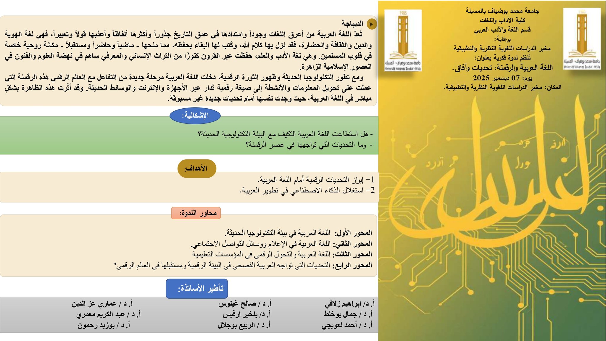 ندوة فكرية بعنوان اللغة العربية والرقمنة تحديات وآفاق يوم 07 ديسمبر 2025