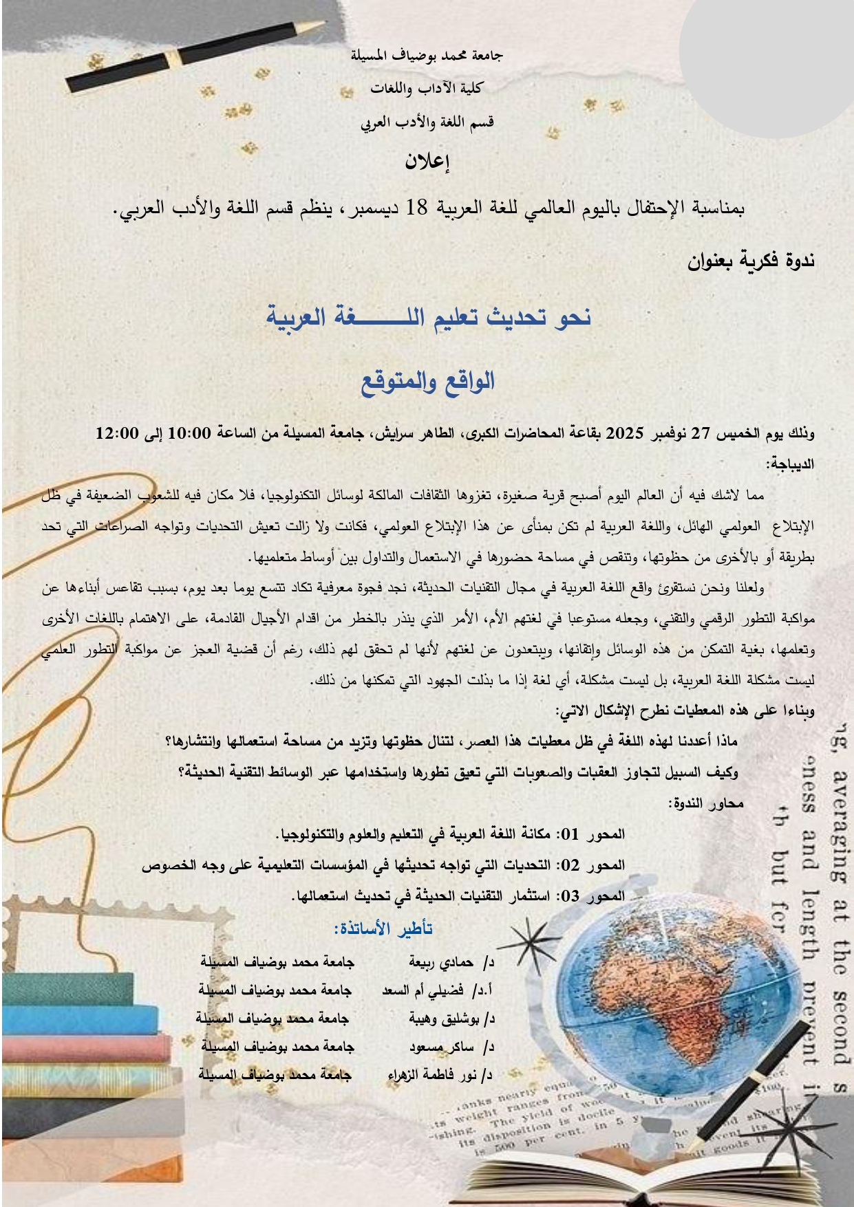 بمناسبة الاحتفال باليوم العالمي للغة العربية (18 ديسمبر) ، ينظّم قسم اللغة والأدب العربي بكلية الآداب واللغات، جامعة محمد بوضياف المسيلة ، ندوة فكرية بعنوان: