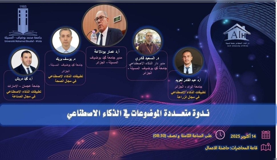 تنظم دار الذكاء الاصطناعي بجامعة محمد بوضياف بالمسيلة ندوة متعددة المحاور حول تطبيقات الذكاء الاصطناعي، وذلك يوم الثلاثاء 14 أكتوبر 2025 على مستوى قاعة المحاضرات بحاضنة الاعمال -القطب الجامعي-