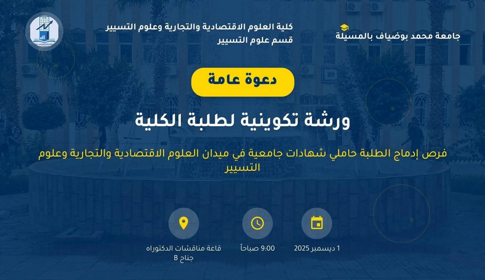 في إطار سياسة الانفتاح وتعزيز قابلية تشغيل الخريجين، نظّمت كلية العلوم الاقتصادية والتجارية وعلوم التسيير – جامعة المسيلة يوم الاول ديسمبر 2025 ابتداءا من الساعة التاسعة صباحا بقاعة مناقشات الدكتوراه بالجناح B،ورشة تكوينية موجّهة لطلبة الكلية تحت عنوان: