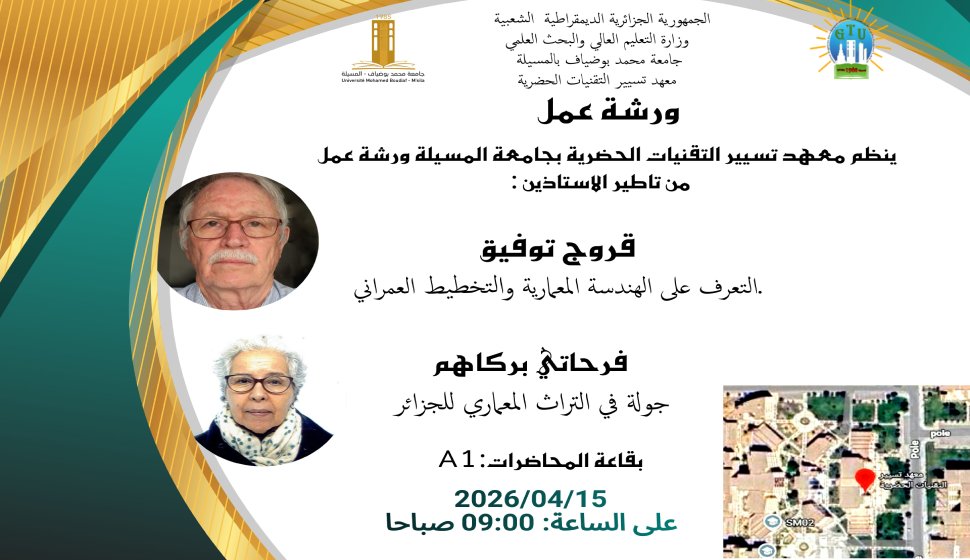 ينظم معهد تسيير التقنيات الحضرية بجامعة المسيلة ورشة عمل من تاطير الاستاذين : قروج توفيق و فرحاتي بركاهم حول التعرف على الهندسة المعمارية و التخطيط العمراني تحميل المطوية باللغة العربية