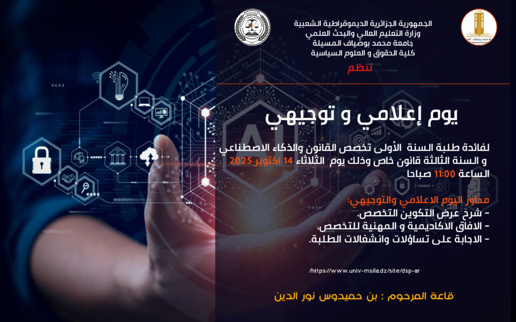 تنظم كلية الحقوق والعلوم السياسية بجامعة محمد بوضياف بالمسيلة يوم إعلامي وتوجيهي لفائدة طلبة السنة الأولى تخصص القانون والذكاء الاصطناعي والسنة الثالثة قانون خاص، وذلك يوم الثلاثاء 14 أكتوبر 2025 على الساعة 11:00 صباحا، بقاعة المحاضرات المرحوم بن حميدوش نور الدين.