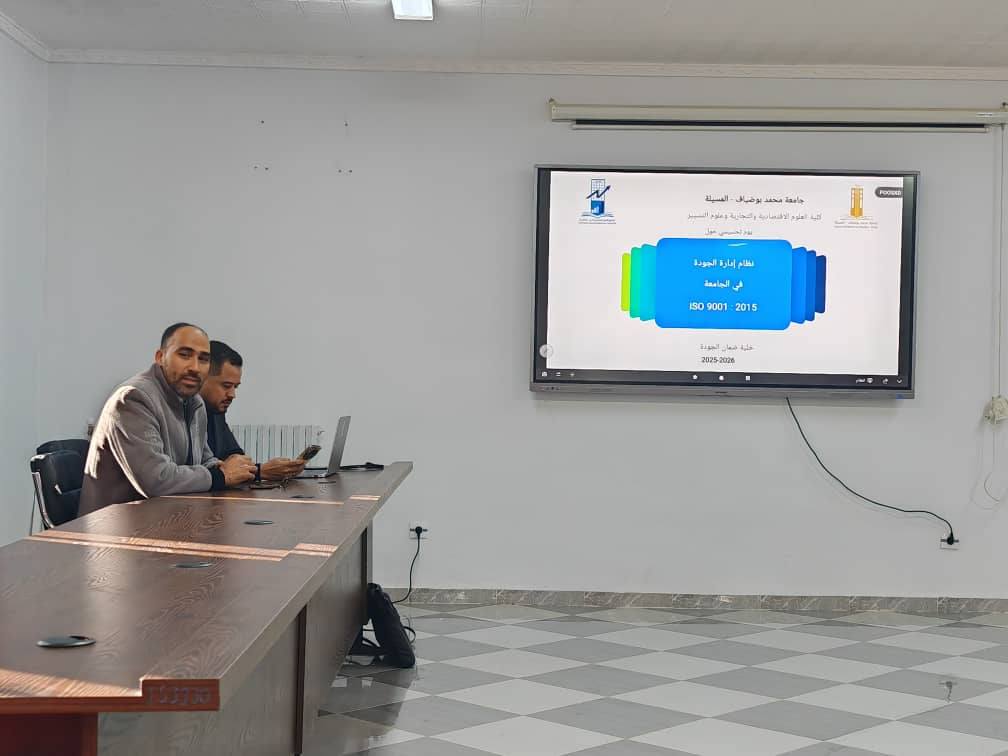 تم اليوم بكلية العلوم الإقتصادية والتجارية وعلوم التسيير تنظيم يوما تحسيسيا حول إدارة الجودة ومعايير ISO9001 جرى هذا اليوم تحت إشراف عميد الكلية البروفيسور ختيم محمد العيد، من تأطير الأستاذ قانة حسين والأستاذ الجربي أحمد