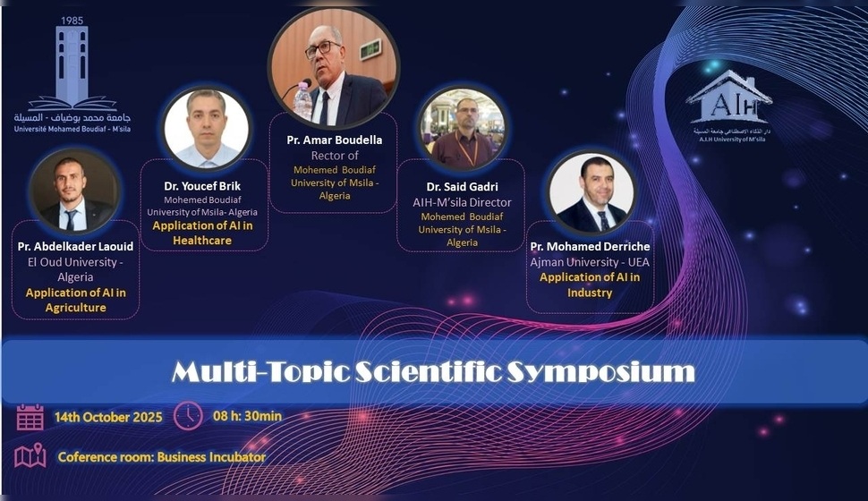 The Artificial Intelligence Center at Mohamed Boudiaf University of M’sila is organizing a multi-topic symposium on Artificial Intelligence and its applications. The event will take place on Tuesday, October 14, 2025, at the lecture hall of the Business Incubator – University Hub.