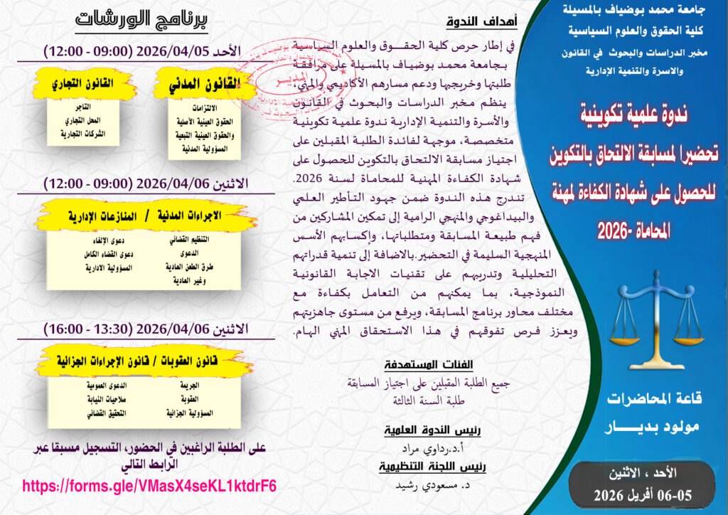 The Laboratory of Studies and Research in Law, Family and Administrative Development at the Faculty of Law and Political Science, Mohamed Boudiaf University of M’sila, is organizing a scientific training seminar in preparation for the professional competency examination for the legal profession (Bar Exam), on Sunday and Monday, April 5 – 6, 2026, at Mouloud Bediaf Lecture Hall.