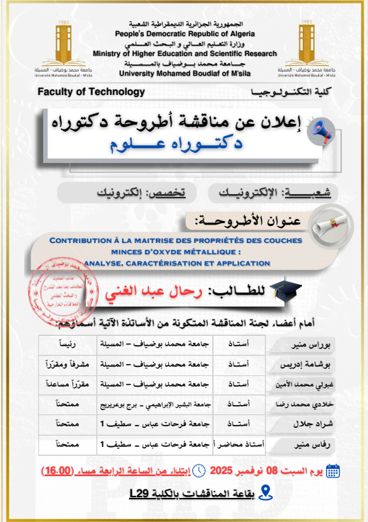 The Faculty of Technology announces that the PhD thesis (third cycle) of the student Rahal Abdelghani will be defended.
