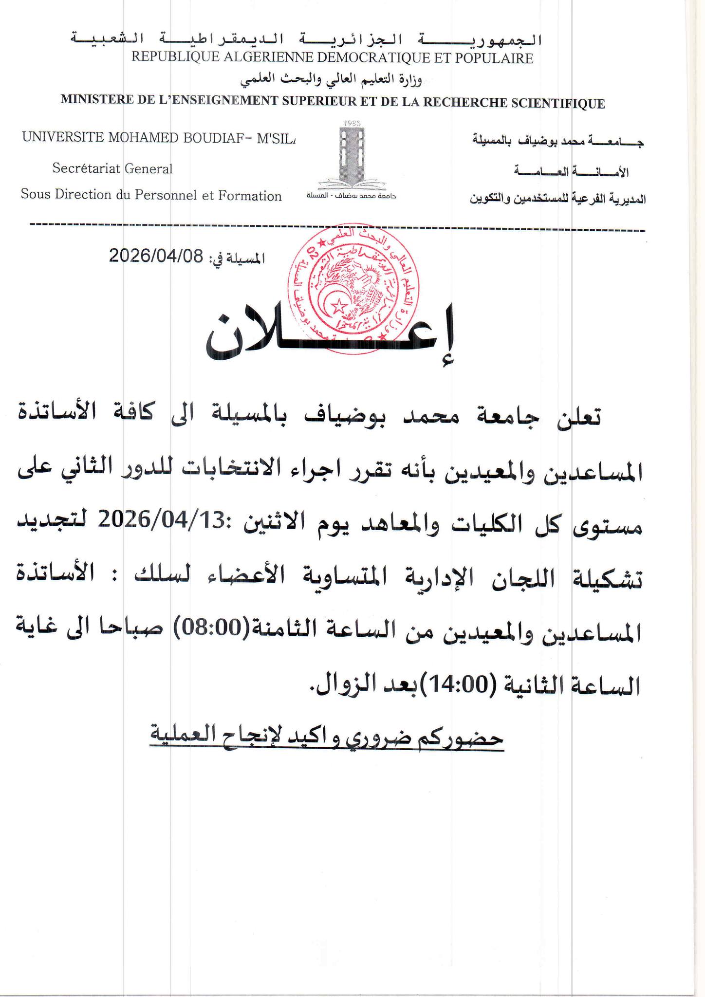 Mohamed Boudiaf University – M’Sila hereby informs all Assistant Professors and Teaching Assistants that the second round of elections to renew the membership of the Joint Administrative Committees has been scheduled.