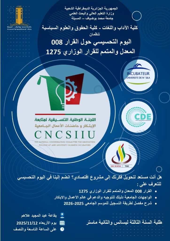 The Faculty of Law and Political Science and the Faculty of Arts and Languages at Mohamed Boudiaf University of M’Sila are organizing, for the benefit of third-year Bachelor’s and second-year Master’s students, an awareness day on Decree 008, which amends and supplements Ministerial Decree 1275. The event will take place on Wednesday, November 12, 2025, at Abd Elmadjid Alahoum Hall.