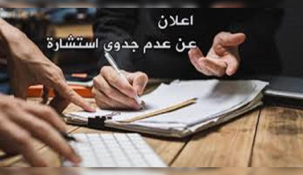 الاعلان عن عدم جدوى الاستشارة رقم : 16 لسنة 2026 التعيين تحميل الاستشارة عدم جدوى الاستشارة رقم : 16 لسنة 2026