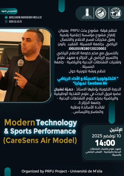 على هامش المؤتمر الدولي العلمي الأول حول )) الذكاء الإصطناعي في الإعلام الرياضي وأخلاقيات المهنة – الممارسة والتحديات ((-المنظم يومي الاثنين والثلاثاء 10 /11 نوفمبر 2025 . تنظم الورشة التكوينية المجانية الثالثة تحت عنوان :((التكنولوجيا الحديثة و الأداء الرياضي CareSens Air نموذجا )) لفائدة الأساتذة و طلبة الدكتوراه و الماستر و الليسانس,وذلك يوم الأثنين 10 نوفمبر 2025 على الساعة 14:00 مساءا بمعهد علوم وتقنيات النشاطات البدنية والرياضية – جامعة المسيلة.
