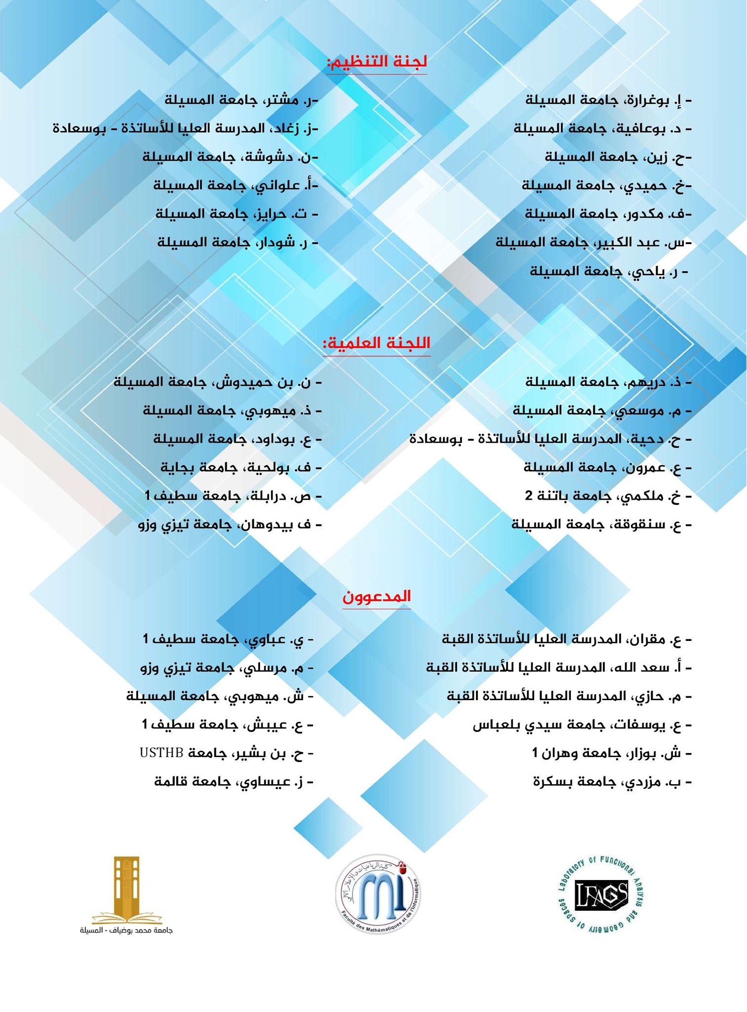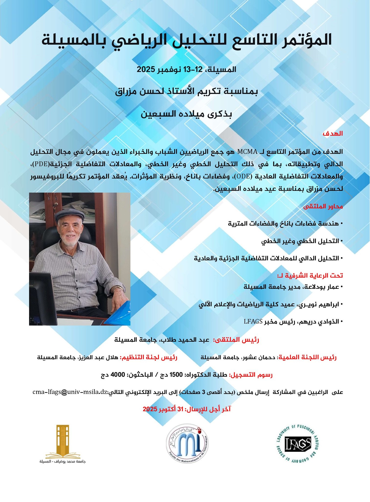 تحت اشراف السيد مدير جامعة المسيلة، البروفيسور عمار بودلاعة والسيد عميد كلية الرياضيات والاعلام الآلي، البروفيسور نويري ابراهيم والسيد رئيس مخبر LFAGS الأستاذ دريهم الذوادي انعقاد المؤتمر التاسع للتحليل الرياضي بالمسيلة.وذلك يومي 13-12 نوفمبر 2025 تكريما للبروفيسور لحسن مزراق بمناسبة عيد ميلاده السبعين.