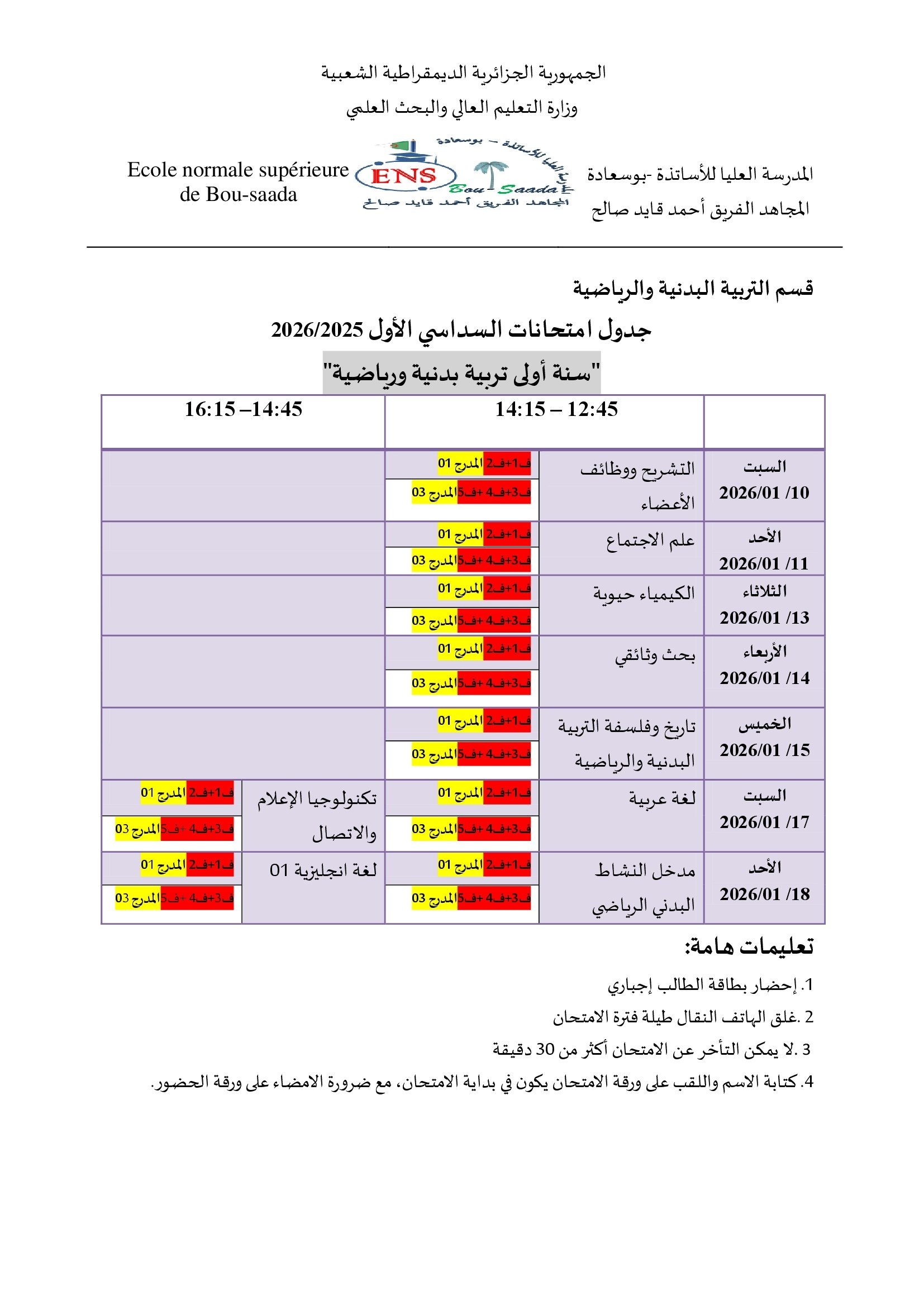 First Semester Exam Schedule (Assessment Point – Higher School for Teachers)