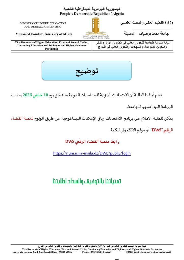 Students of the Faculty of Law and Political Science at Mohamed Boudiaf University of M’sila are hereby informed that the exams for the transversal and exploratory modules, which were scheduled from January 4 to January 7, 2025, have been postponed. These exams will be held together with the first-semester exams starting from January 10, 2025, according to a schedule that will be announced soon.