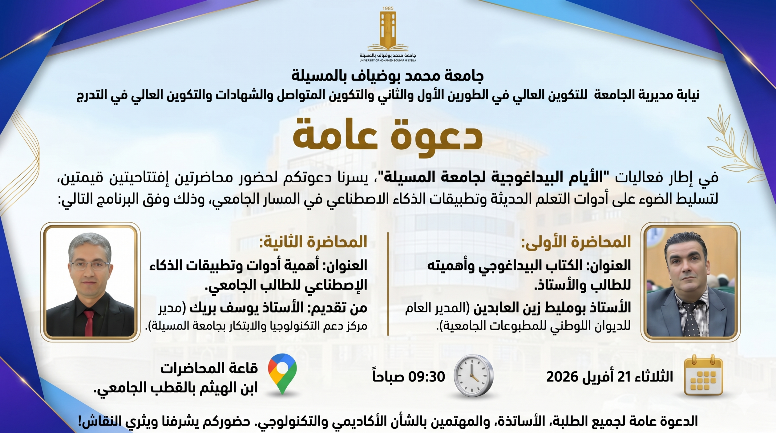 I am pleased to invite my fellow professors to attend the opening ceremony of the Pedagogical Days on Tuesday, April 21, 2026 at 9:30 a.m. in the Ibn Al-Haytham Lecture Hall at the University Campus.