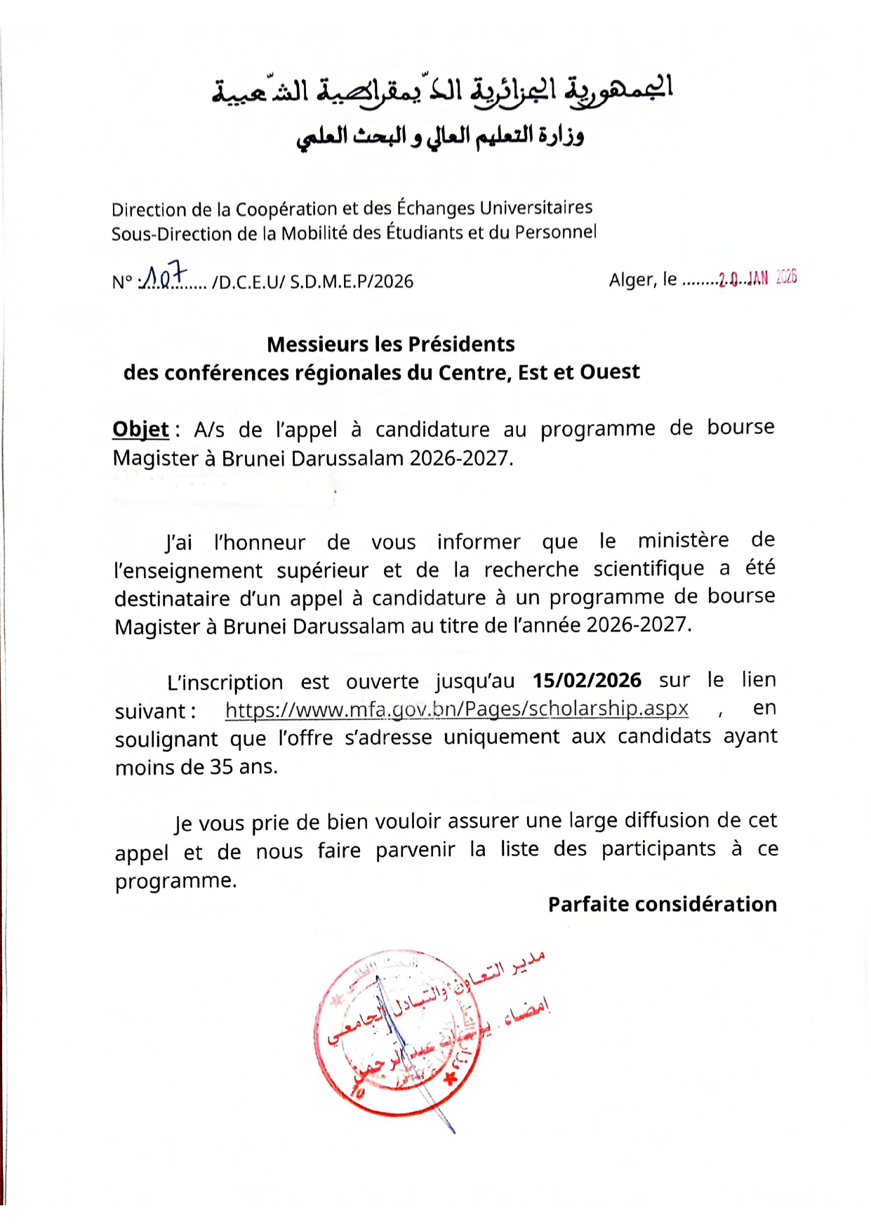 The Ministry of Higher Education and Scientific Research announces the opening of applications for the Master’s Scholarship Program in Brunei Darussalam for the 2026-2027 academic year.