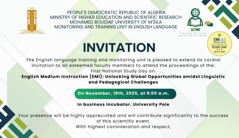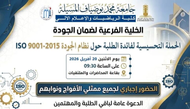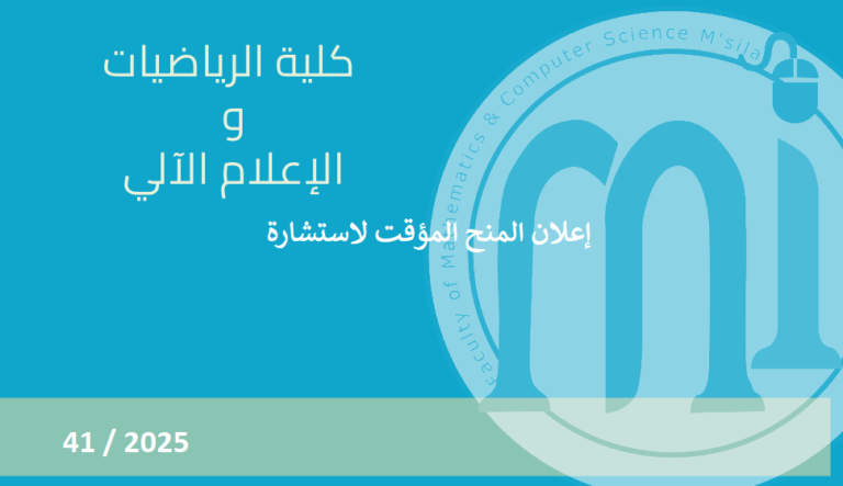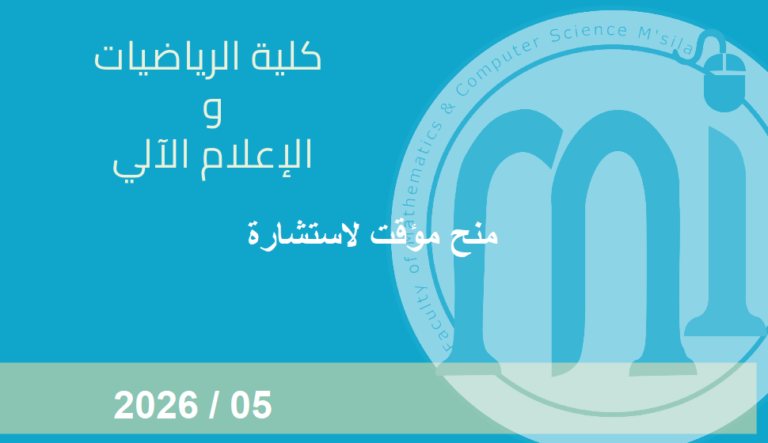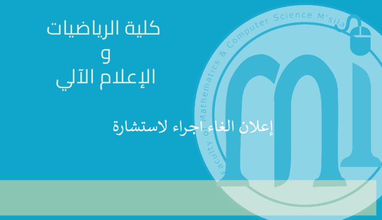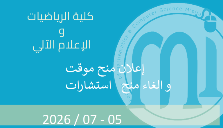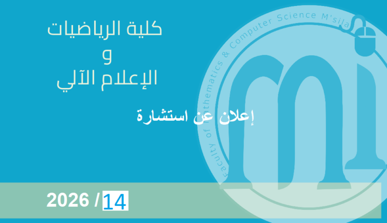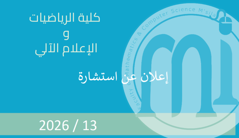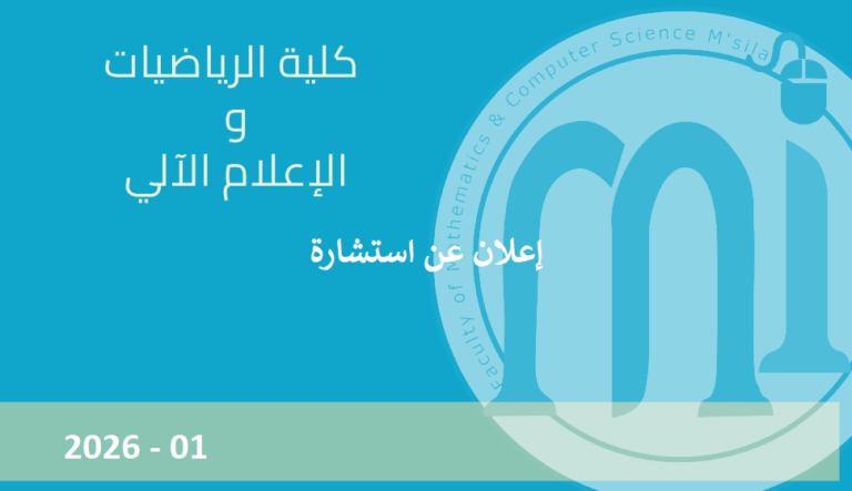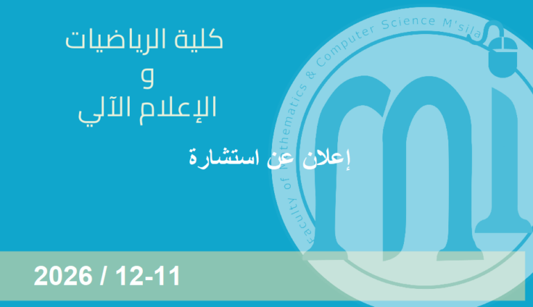 أعضاء هيئة التدريس والإداريين بكلية الرياضيات و الإعلام الآلي يرحبون بكم في البوابة الإلكترونية لكليتنا. نأمل أن تكون هذه البوابة الإلكترونية وسيلة فعالة للتفاعل لخدمة طلابنا وأي شخص آخر مهتم، وذلك من أجل تحسين التكوين و البحث العلمي في كليتنا والمساهمة في تطور جامعة المسيلة .