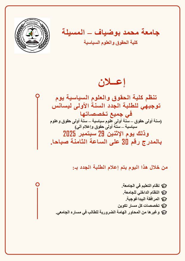 Orientation Day for Newly Admitted First Year Bachelor’s Students – All Fields of Study Date 27 September، 2025 Share: Webmaster DSP Previous post Discussion of a doctoral thesis entitled "The Phenomenon of War in Strategic Thought: A Study of Philosophical Foundations and Practical Policies" by student Fenni Abd Elkrim. 27 September، 2025 Next post Call for Applications - International Independent Scientific Committee on Artificial Intelligence 29 September، 2025