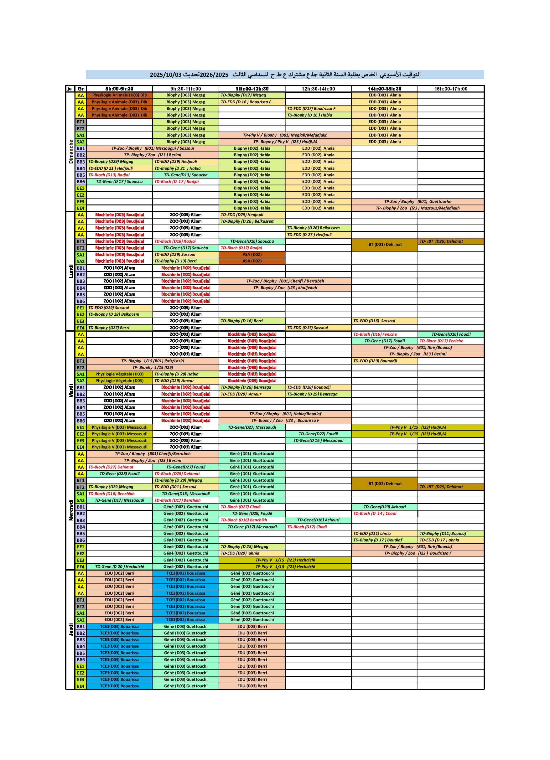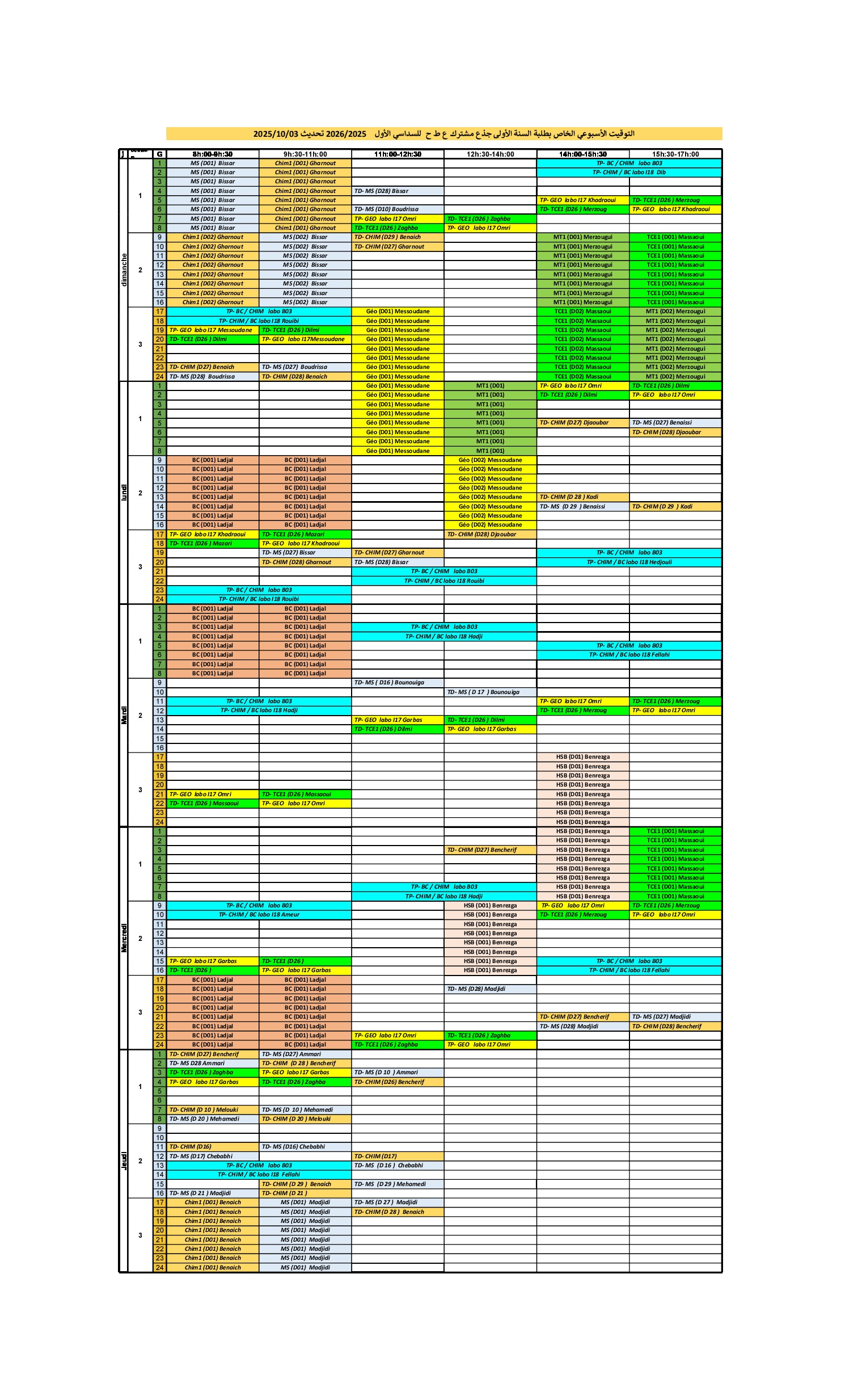 التوقيت الأسبوعي للسداسي الأول 2025-2026 جذع مشترك علوم الطبيعة و الحياة SNV السنة اولى TCSNVالسنة الثانية TCSNV جذع مشترك علوم المادة SM السنة اولى علوم المادة SM قسم الفيزياء السنة ثانية ليسانس فيزياءالسنة ثالثة ليسانس فيزياءالسنة اولى ماستر فيزياءالسنة ثانية ماستر فيزياء قسم الكيمياء السنة الثانية كيمياءالسنة الثالثة ليسانس كيمياءالسنة اولى ماستر كيمياءالسنة الثانية ماستر كيمياء قسم علوم الطبيعة و الحياة SNV السنة الثالثة ليسانس SNVالسنة الاولى ماستر SNVالسنة الثانية ماستر SNV قسم البيوكيمياء و الكيمياء الحيوية السنة الثالثة ليسانس قسم العلوم الفلاحية LMD علوم فلاحيةمهندس في العلوم الفلاحية قسم العلوم البيطرية السنة اولى علوم البيطريةالسنة الثانية علوم البيطريةالسنة الثالثة علوم البيطرية ملحقة الطب السنة اولى طبالسنة الثانية طب السنة الثالثة طب البرنامج الأسبوعي للسداسي الثاني 2026/2025 تجدون التوقيت الزمني على منصة فضاء الطالب DWS رابط المنصة : http://num.univ-msila.dz/DWEإسم المستخدم : هو رقم التسجيل الموجود على بطاقة الطالبكلمة المرور : هي تاريخ ميلاد الطالب