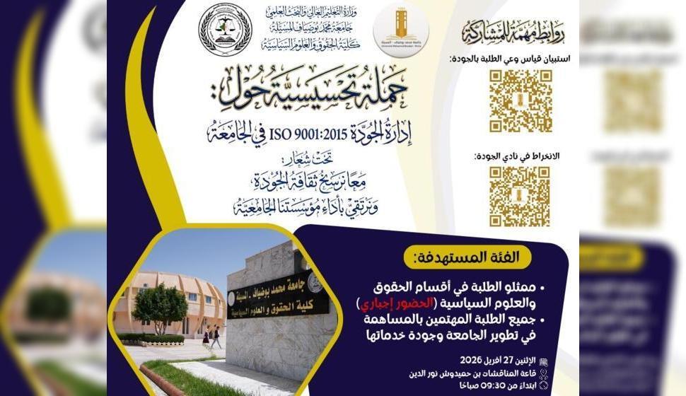 في إطار ترسيخ ثقافة الجودة والارتقاء بالأداء الجامعي، والمساهمة في مسعى الجامعة للحصول على 9001:2015 ISO تنظم الخلية الفرعية لضمان الجودة بكلية الحقوق والعلوم السياسية، جامعة محمد بوضياف بالمسيلة حملة تحسيسية حول: نظام إدارة الجودة ISO 9001:2015 في الجامعة. تحت شعار معًا …