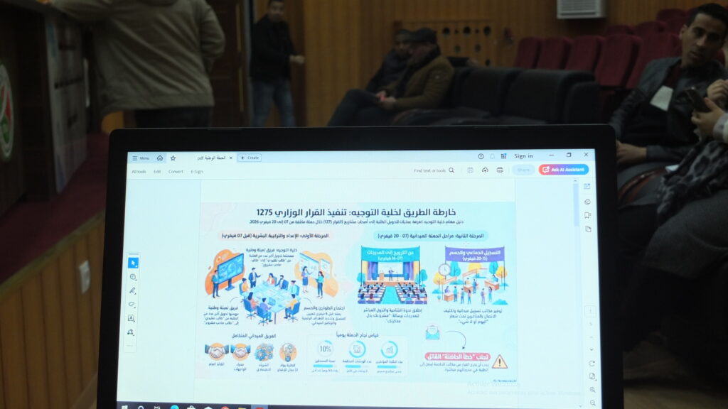 في إطار تعزيز ثقافة الإتقان، احتضنت قاعة المحاضرات بالمعهد، صباح اليوم الإثنين 09 فيفري 2026، اجتماعاً تنسيقياً لخلية التوجيه لتنفيذ القرار الوزاري 1275 نشطه مدير المعهد و رئيس ميدان التكوين و أعضاء الخلية قصد ضبط إيقاع العمل الإداري والبيداغوجي وفق المعايير .