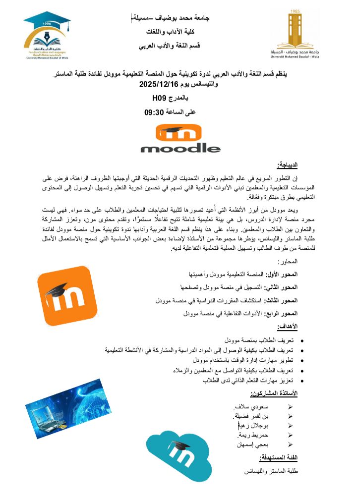 The Department of Arabic Language and Literature is organizing a training seminar on the Moodle learning platform for Master’s and Bachelor’s students on December 16, 2025, in Lecture Hall H09 at 9:30 AM